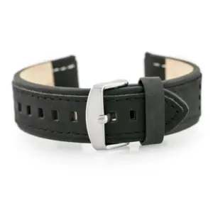 Természetes bőrből készült fekete óraszíj fekete varrással és ezüstszínű fém csattal. Klasszikus megjelenése kényelmes viselettel és tartós kialakítással párosul, így ideális választás a mindennapi használathoz.
