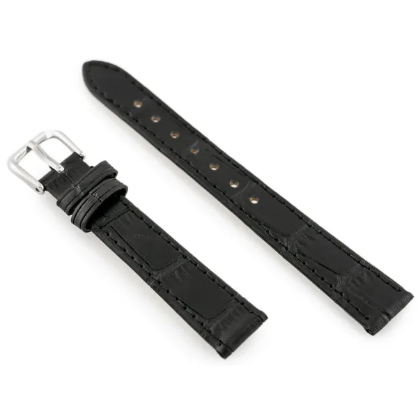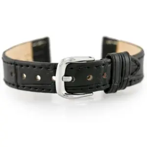 Fekete színű, természetes bőrből készült óraszíj fekete varrással és ezüstszínű fém csattal. Klasszikus megjelenése miatt elegáns és hétköznapi órákhoz is jó választás.