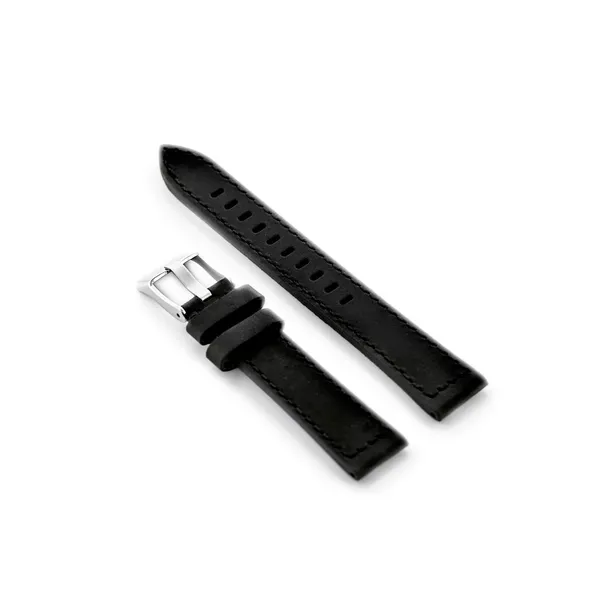Természetes bőrből készült fekete óraszíj fekete varrással és ezüstszínű fémcsattal. Klasszikus megjelenésével kényelmes és elegáns választás a mindennapi viselethez.