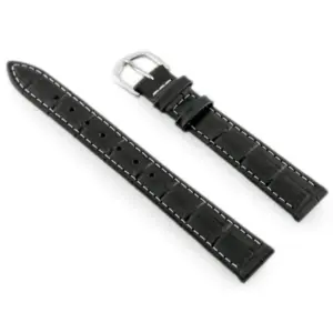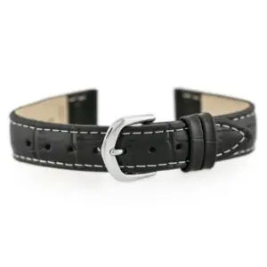 Természetes bőrből készült fekete óraszíj elegáns fehér varrással. Az ezüstszínű rozsdamentes acél csat tartós, kényelmes és mindennapi használatra is ideális.