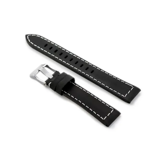 Természetes bőrből készült fekete óraszíj elegáns fehér varrással. A kényelmes viseletről és a biztos rögzítésről ezüstszínű fémcsat gondoskodik, így praktikus és stílusos választás a mindennapi használathoz.