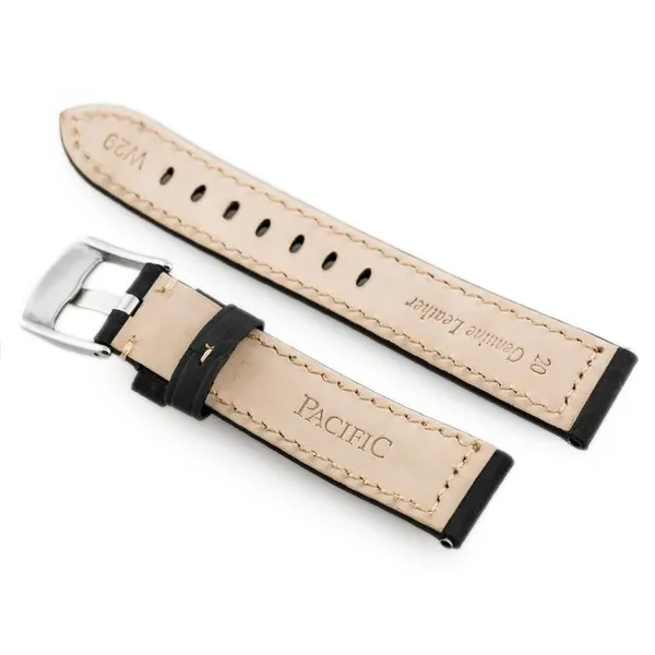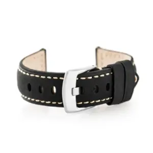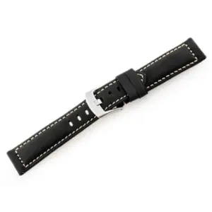 Természetes bőrből készült fekete óraszíj, elegáns fehér varrással és ezüstszínű fém csattal. Kényelmes viseletet és klasszikus megjelenést biztosít a mindennapokban, miközben könnyen kombinálható különféle óratokokkal.