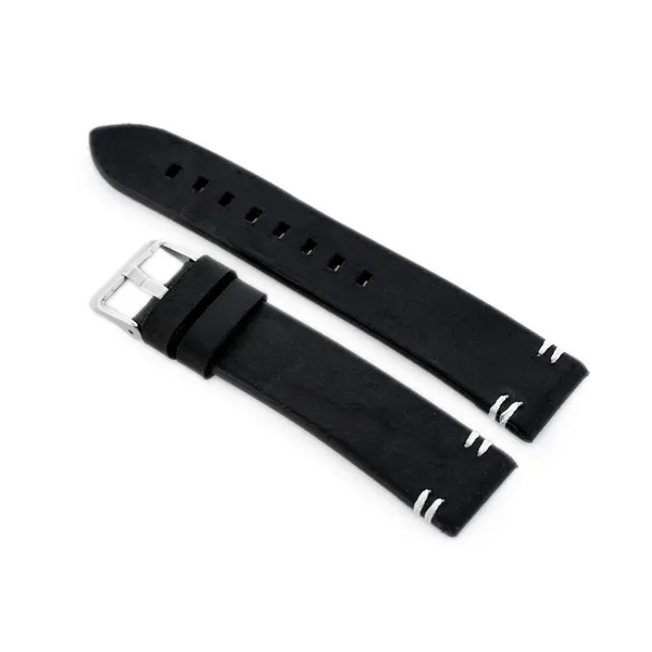 Természetes bőrből készült fekete óraszíj, elegáns fehér varrással és ezüstszínű fémcsattal. Kényelmes viseletet és klasszikus megjelenést biztosít, így ideális választás a 22 mm-es tokfülszélességű karórákhoz.