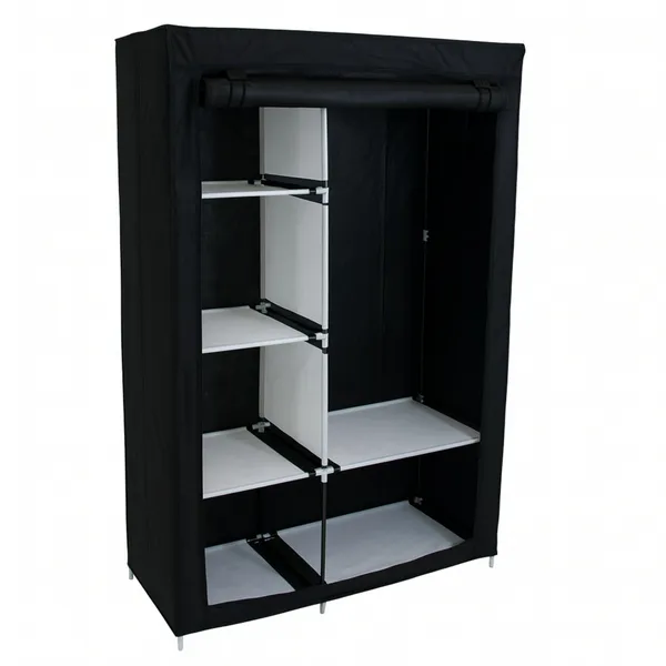 Rendszerezd a ruháidat gyorsan: a stabil fémvázas, fekete textil ruhásszekrény polcokkal, akasztórúddal és oldalzsebekkel segít átlátható tárolást kialakítani. A teljes borítás alul is védi a ruhákat a portól, így ideális otthonra, irodába vagy diák­szobába.