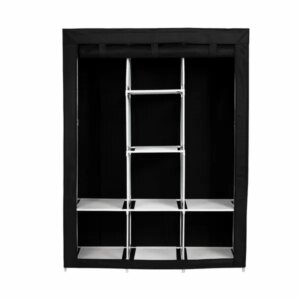 A fekete textil ruhásszekrény XL könnyű, praktikus és meglepően tágas megoldás ruhák tárolására otthon, gardróbban, hálószobában vagy gyerekszobában. A fémcsöves váz és a tartós, cipzáras huzat stabil tartást ad, miközben megvédi a ruhákat a portól.