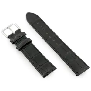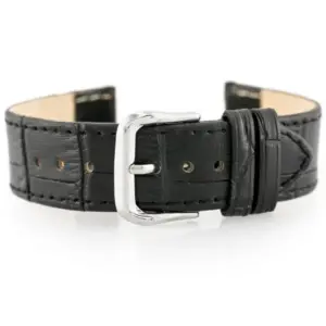 Természetes bőrből készült óraszíj fekete színben, fekete varrással. Az elegáns megjelenést ezüstszínű fém csat egészíti ki, így kényelmes és stílusos választás a mindennapi viselethez.