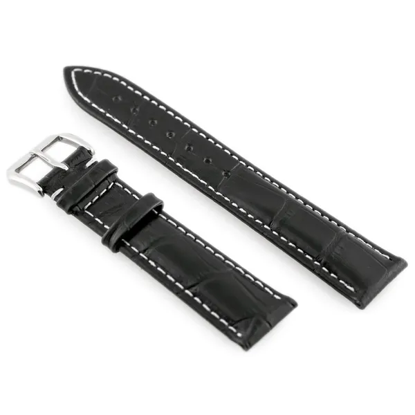 Természetes bőrből készült fekete óraszíj elegáns fehér varrással és ezüstszínű fém csattal. Kényelmes viseletet biztosít, klasszikus megjelenése pedig jól illik sportos és hétköznapi órákhoz egyaránt.