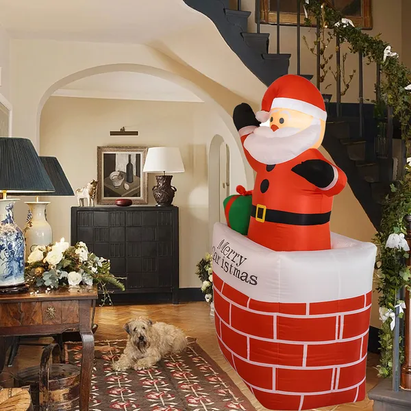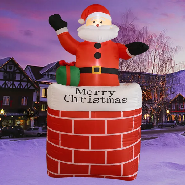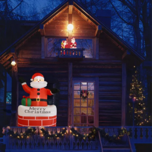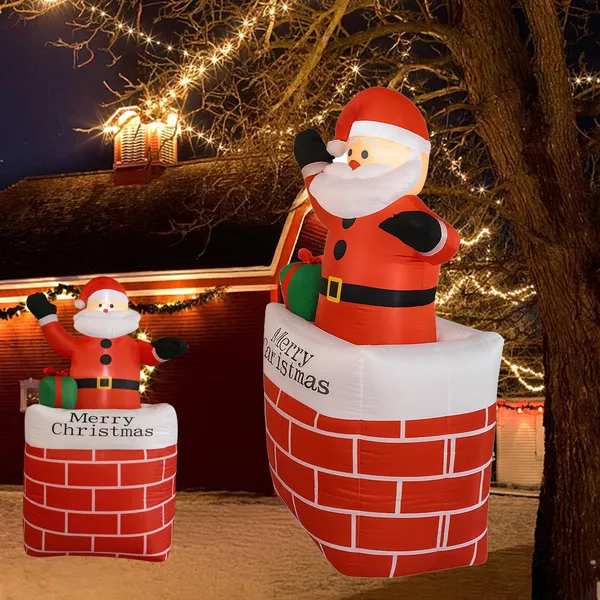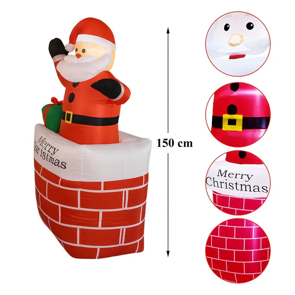 A 150 cm magas, LED-világítású felfújható Mikulás kéményben pillanatok alatt üzembe helyezhető, és látványos fókuszponttá varázsolja a kertet vagy a nappalit. Automatikus ventilátora, tartozék rögzítőkötelei és időjárásálló poliésztere gondtalanná teszi a használatot.