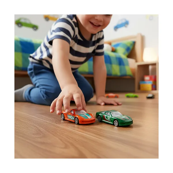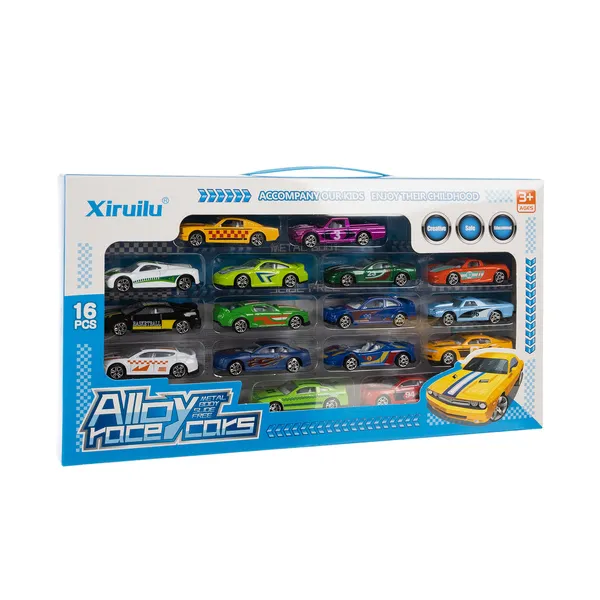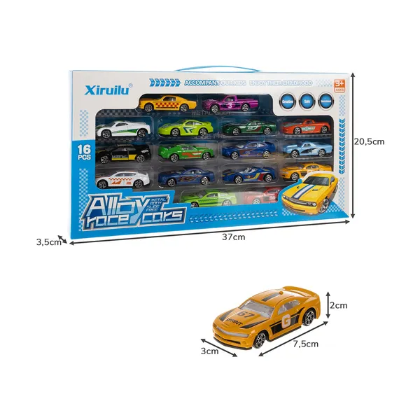 16 darab színes, fém felhúzhatós kisautó egy csomagban, hogy a gyerekek azonnal versenyezhessenek és közösen játszhassanak. A masszív kivitel jól bírja a mindennapi használatot, miközben a játék fejleszti a koordinációt és a kreatív történetmesélést.