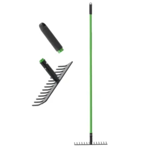 A 14 fogú fém gereblye masszív porfestett acél feje és könnyű, mégis rendkívül merev üvegszálas nyele révén ideális társ a kerti talaj elegyengetéséhez, lomb- és törmelékgyűjtéshez, sőt kisebb építési munkákhoz is. A csúszásmentes markolat kényelmes fogást ad, a végén lévő akasztó pedig megkönnyíti a tárolást.