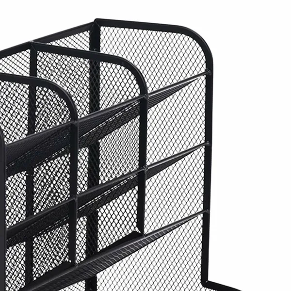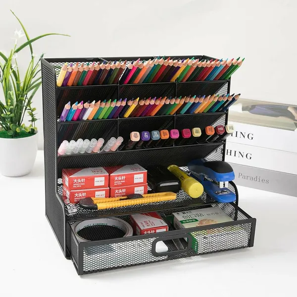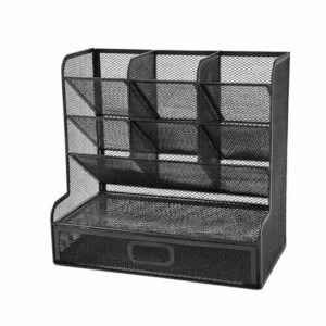 A fekete, fém hálós íróasztali rendszerező segít átláthatóvá tenni a munkaterületet, így a legfontosabb irodaszerek mindig kéznél maradnak. A 9 különálló rekesz lehetővé teszi tollak, ceruzák, filcek, jelölők és egyéb kisebb kiegészítők rendezett tárolását, míg az alsó fiók ideális a könnyen elkeveredő apróságok számára.
