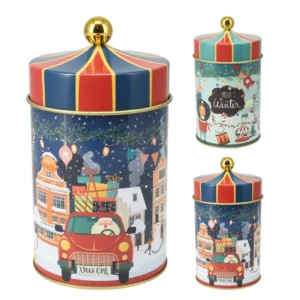Stílusos, vintage mintás fém tárolódoboz, amely 10 cm átmérővel és 18 cm magassággal rendelkezik. Tartós bádogból készült, belső felületén élelmiszerbiztos lakkozással, így ideális száraz élelmiszerek vagy apró tárgyak tárolására.