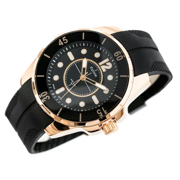 Az Extreim a népszerű G. Rossi almárkája, amely kedvező áron kínál látványos, férfias stílusú karórákat. Ez a modell fekete számlappal, fekete gumiszíjjal és rézvörös-arany színű tokkal készült, így sportos és elegáns megjelenést ad a mindennapokra.