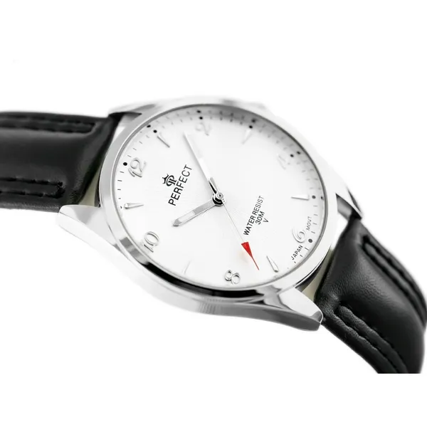 Elegáns, klasszikus megjelenésű férfi karóra hosszú fekete bőrszíjjal, ezüst színű számlappal és ezüst tokban. A letisztult, pontjelöléses számlap és a karcsú mutatók könnyen áttekinthetővé teszik az idő leolvasását, miközben az óra jól illik hétköznapi és alkalmi öltözékhez is.