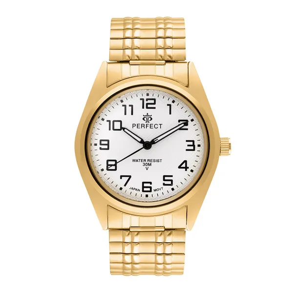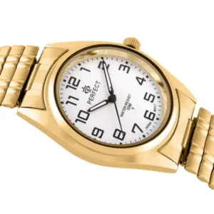 Férfi karóra elegáns, arany színű tokkal és ezüst színű számlappal. Letisztult megjelenése miatt jó választás mindennapi viselethez és alkalmi öltözékhez is.