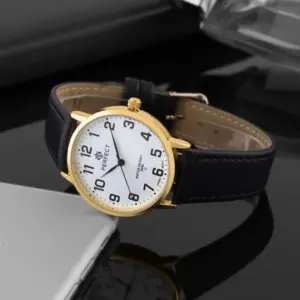 Elegáns, letisztult férfi karóra, amely klasszikus megjelenésével jól illik mindennapi viselethez és alkalmi öltözékhez is. Az arany színű tok és a fehér számlap időtálló, könnyen kombinálható stílust képvisel.