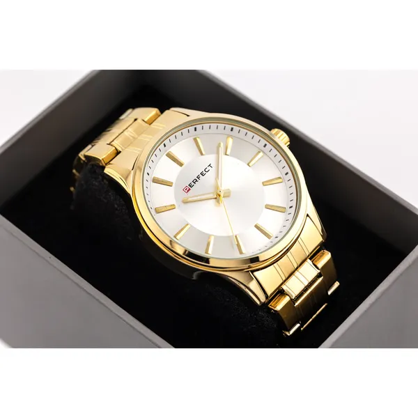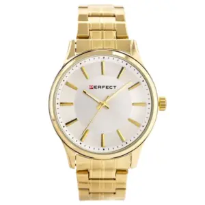 A Perfect férfi karóra klasszikus, elegáns megjelenést kínál a mindennapi viselethez és alkalmi öltözékhez is. A japán Miyota kvarc szerkezet pontos működést biztosít, míg az aranyszínű fém tok és szíj, valamint az ezüst színű számlap időtálló összhatást teremt.