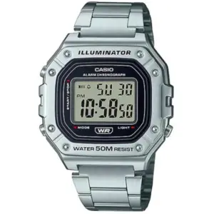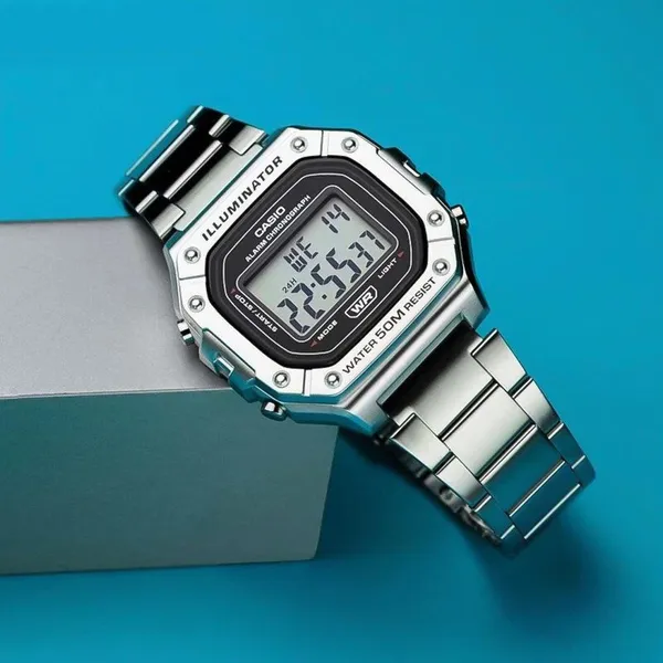 Praktikus digitális karóra rozsdamentes acél szíjjal, jól látható kijelzővel és hasznos funkciókkal, mint a stopper, ébresztő és automatikus naptár. A WR50 vízállóság és a LED háttérvilágítás kényelmes, megbízható társává teszi a mindennapokban.