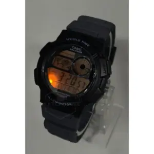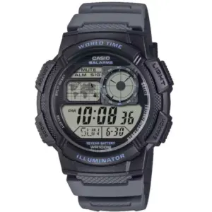 Praktikus digitális karóra világidővel, stopperrel, ébresztővel és LED-es megvilágítással, amely utazáshoz és mindennapi használatra is kiváló. A WR100 vízállóság és a kényelmes szürke műanyag szíj tartós, gondtalan viseletet biztosít.