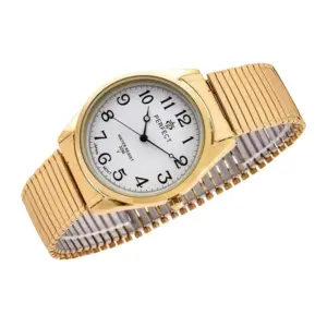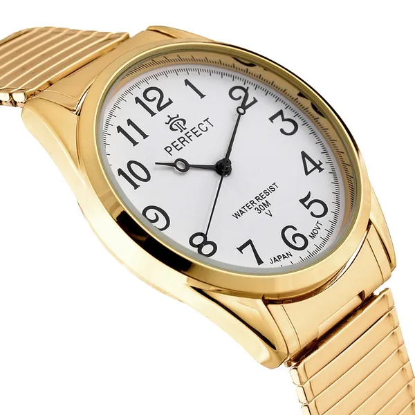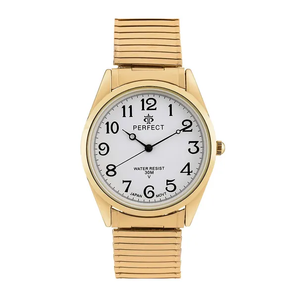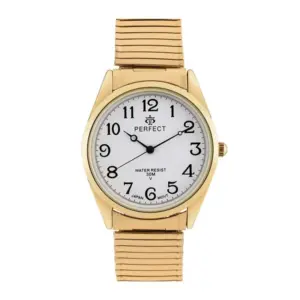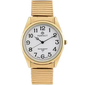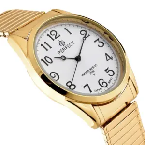 Elegáns, letisztult megjelenésű férfi karóra arany színű tokkal és fehér számlappal. A klasszikus színösszeállításnak köszönhetően jól illik üzleti, alkalmi és hétköznapi öltözékhez is.