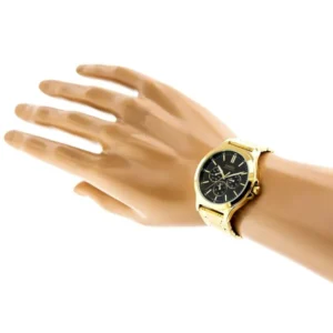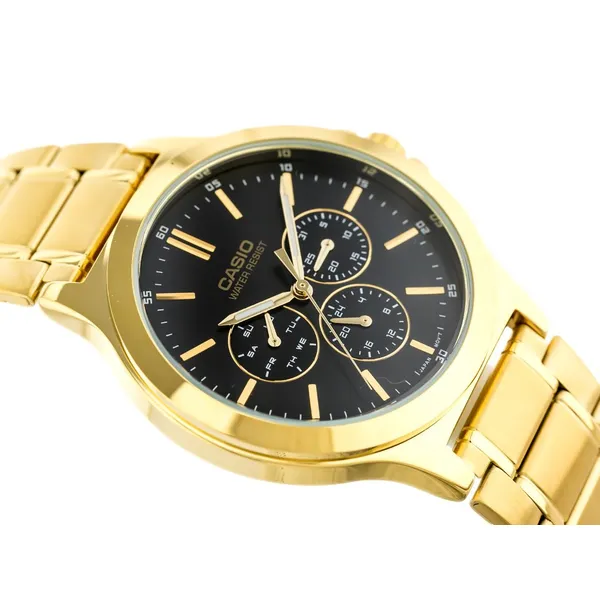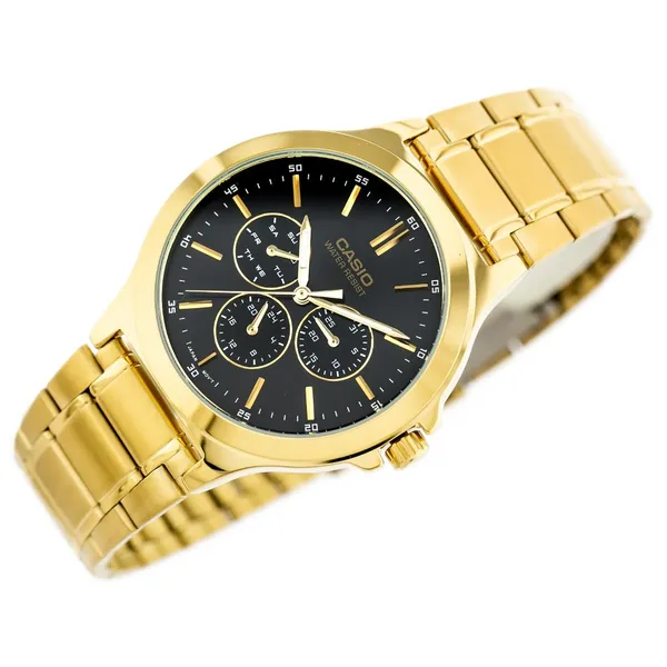 A Casio MTP-V300G férfi karóra aranyszínű rozsdamentes acél tokjával és karkötőjével azonnal elegáns benyomást kelt, miközben japán kvarc szerkezete precíz időmérést biztosít. Fekete számlapját arany indexek és három segédszámlap teszi igazán karakteressé: kronográf, 24 órás kijelzés és nap-dátum mutató.