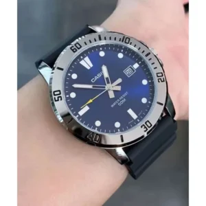 A Casio MTP-VD01-2EVUDF férfi karóra az elegáns, mégis praktikus mindennapokra készült. A letisztult, modern megjelenést a kék számlap és az ezüstszínű, rozsdamentes acél tok teszi igazán időtállóvá, míg a fekete műanyag szíj kényelmes viseletet ad egész nap.