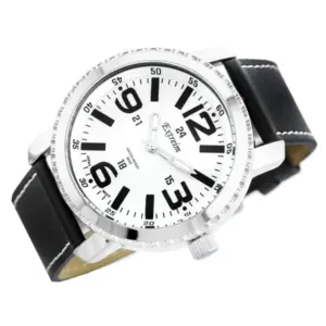 A karórát japán Miyota kvarc szerkezet hajtja, amely pontos időmérést biztosít. A kerek tok, a fehér számlap és a fekete, fehér varrású szíj modern, jól kombinálható megjelenést ad.