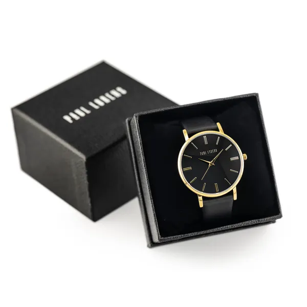 Elegáns megjelenést ad a fekete bőrszíj, az aranyszínű tok és a letisztult számlap kombinációja, miközben a japán кварc szerkezet megbízható, pontos használatot biztosít. Karcsú kialakítása kényelmes viseletet nyújt mindennapokra és alkalmi öltözékhez is.