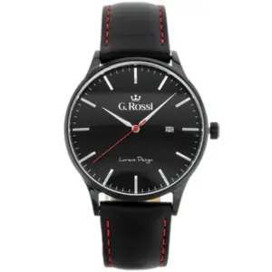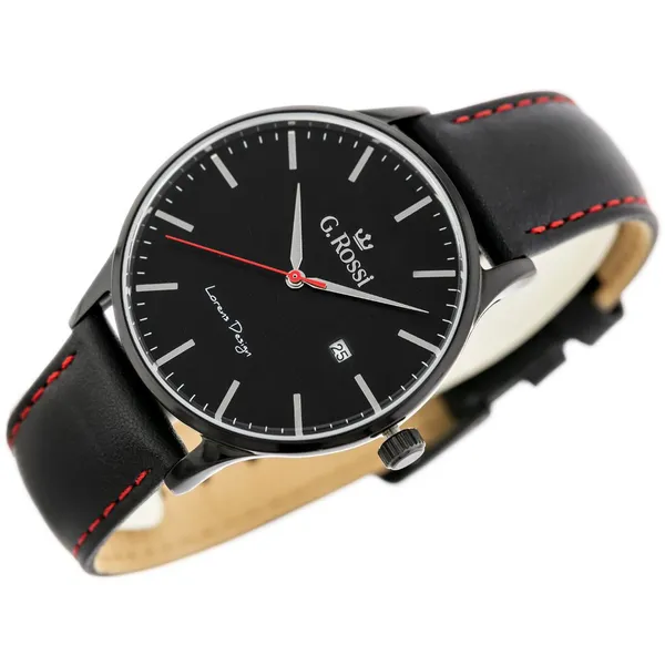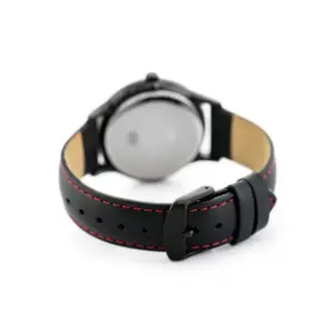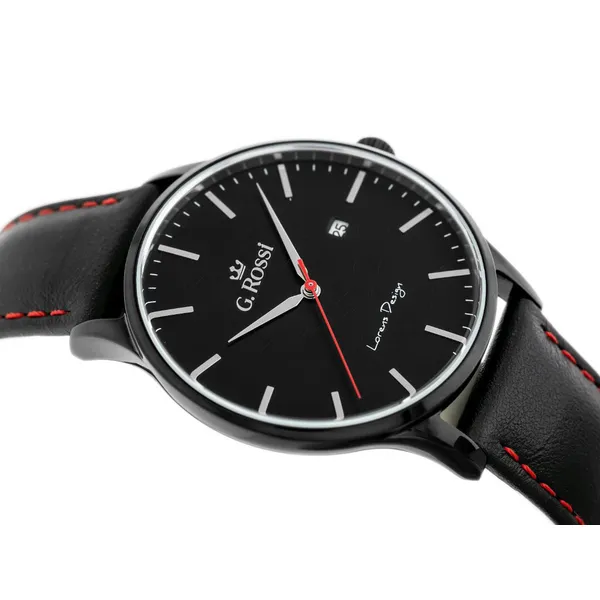 Elegáns és sokoldalú férfi karóra fekete számlappal és fekete bőrszíjjal, piros díszvarrással. A letisztult, kerek tok és a jól olvasható indexek modern megjelenést adnak, így mindennapi viselethez és alkalmi öltözékhez is remek választás.