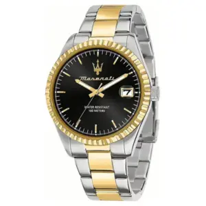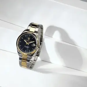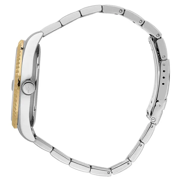 Ez a férfi karóra klasszikus megjelenésével és igényes kidolgozásával ideális választás mindennapi viseletre és elegáns alkalmakra is. Az ezüst- és aranyszínű, rozsdamentes acél tok és csat tartós, korrózióálló kialakítást biztosít, míg a fekete számlap letisztult és férfias hatást kelt. A számlapot ásványi üveg védi, a pontos működésről pedig elemmel működő кварc szerkezet gondoskodik.