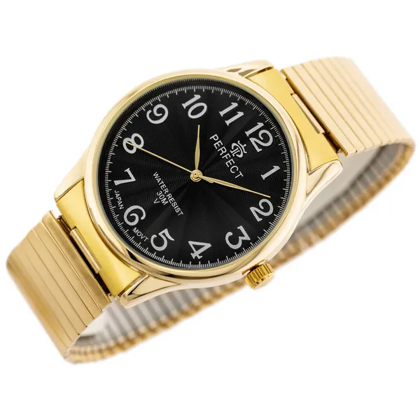 Elegáns, hétköznapi viselethez is jól illő férfi karóra fekete számlappal és aranyszínű tokkal, illetve szíjjal. A kvarc szerkezet japán gyártású, így megbízható és pontos időmérést biztosít. A rugalmas fém szíj megkönnyíti a gyors fel- és levételt, ezért kényelmes választás a mindennapokra.