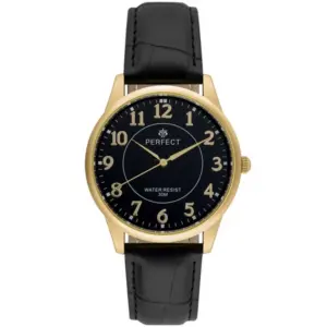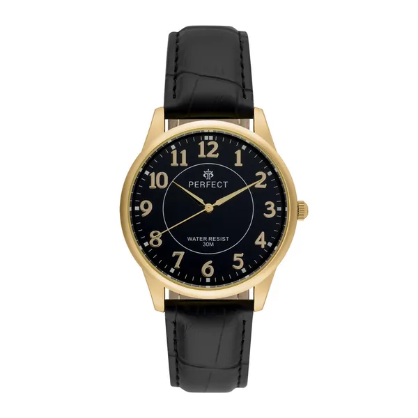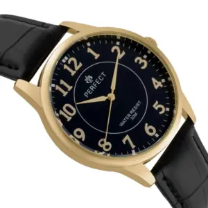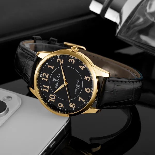 Elegáns megjelenésű férfi karóra fekete számlappal, aranyszínű tokkal és fekete szíjjal, amely könnyen illik üzleti és hétköznapi öltözékhez is. A japán MIYOTA szerkezet, a minerálüveg és az antiallergén bevonat megbízható, kényelmes mindennapi viseletet biztosít.
