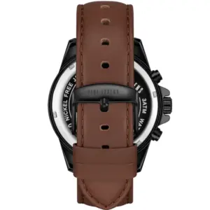 Férfi karóra fekete számlappal, barna bőrszíjjal, dual time