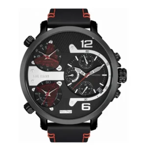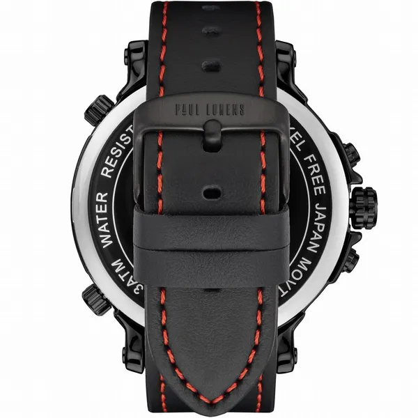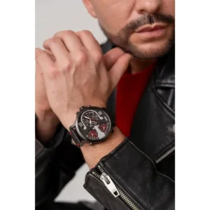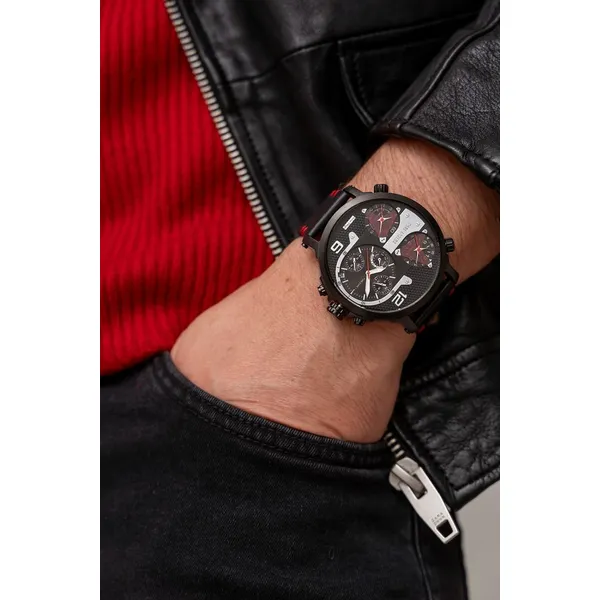 Stílusos, fekete megjelenésű férfi karóra piros varrású bőrszíjjal, amely elegáns és sportos szettekhez is jól illik. A pontos japán MIYOTA kvarc szerkezet, a dátum és a kronográf funkciók pedig praktikus társakká teszik a mindennapokban.