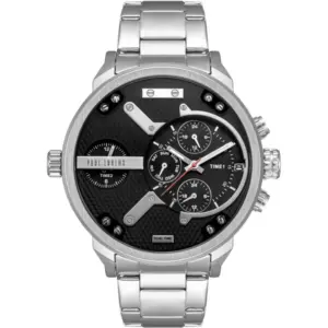 Férfi karóra fekete számlappal, ezüst acél szíjjal, kronográffal