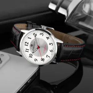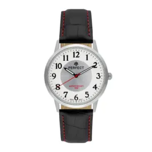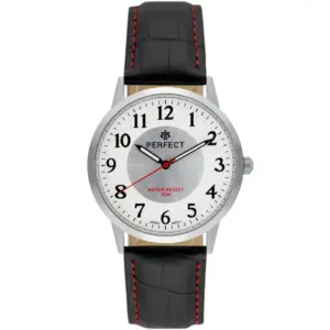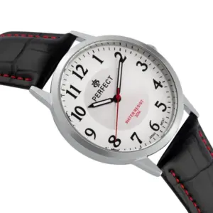 Elegáns és jól használható férfi karóra klasszikus megjelenéssel. A fekete szíj piros díszvarrása karakteres részletet ad, míg a fehér-ezüst számlap jól áttekinthető a mindennapokban.