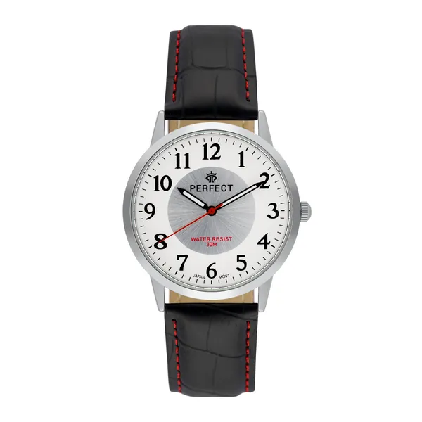 Letisztult, könnyen leolvasható modell fekete szíjjal és piros varrással, amely stílusos választás mindennapi viselethez. A japán кварc szerkezet, az ásványi üveg és a 3 ATM vízállóság megbízható használatot biztosít.