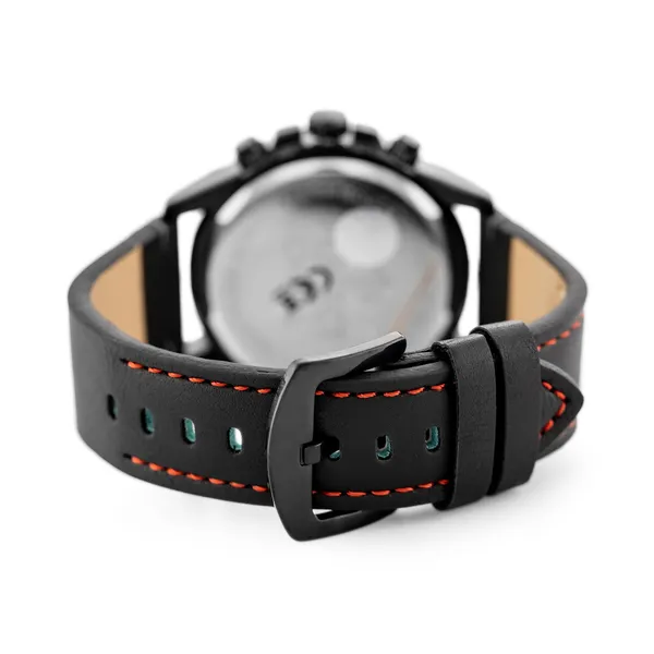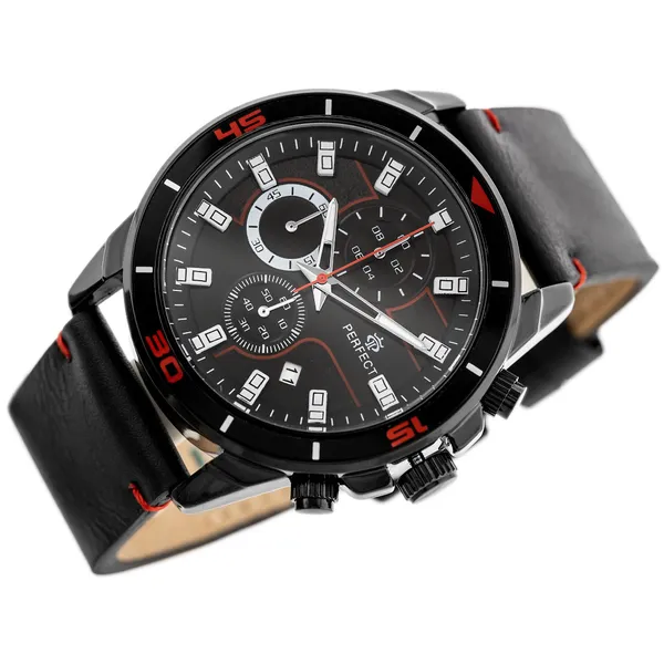 Férfi karóra kronográffal, fekete bőrszíjjal, fekete számlappal