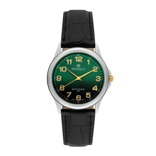 • Karcálló ásványi üveg védi a fekete-zöld számlapot aranyszínű indexekkel.