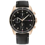A Tommy Hilfiger Parker 1791836 férfi karóra az amerikai márka kifinomult stílusát és mindennapi használhatóságát ötvözi. A rózsaarany színű, rozsdamentes acél tok elegánsan kontrasztál a fekete, valódi bőr szíjjal, míg a fekete számlapon elhelyezett rózsaarany indexek kiemelik az óra karakterét. A megbízható kvarc szerkezetnek köszönhetően mindig pontos időt mutat, a minerál kristályüveg pedig védi a számlapot a karcolásoktól.