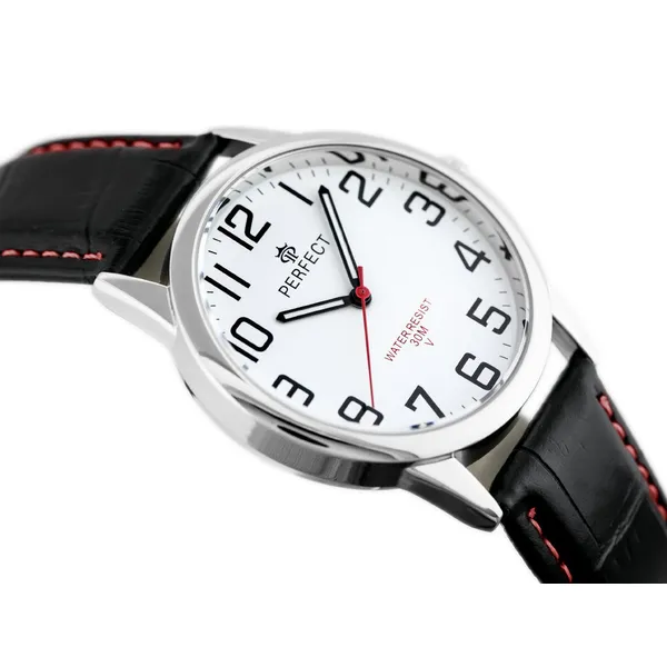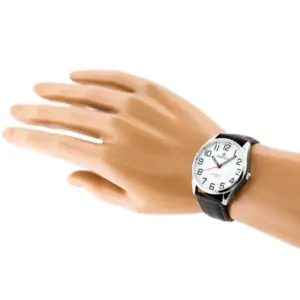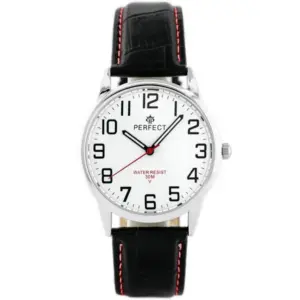Ez a klasszikus férfi karóra elegáns megjelenést kínál a mindennapokra és alkalmi viselethez is. A kerek tok, a letisztult fehér számlap és a fekete bőrszíj időtálló stílust képvisel.