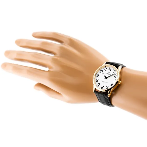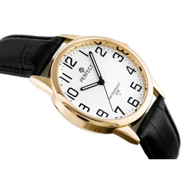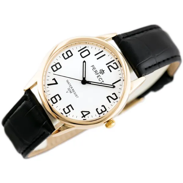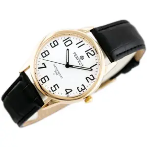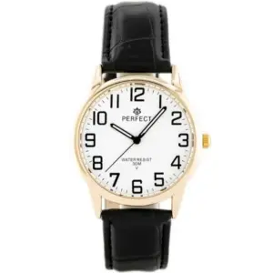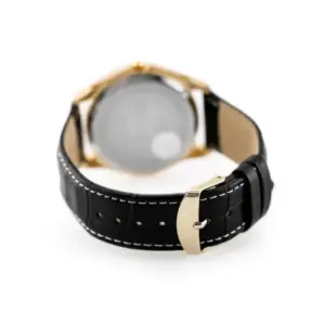 Klasszikus férfi karóra elegáns, időtálló megjelenéssel. A fekete bőrszíj, a fehér számlap és az aranyszínű tok harmonikus összhatást teremt, így ez a modell ideális választás lehet hétköznapi viselethez és alkalmi öltözékhez egyaránt.