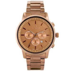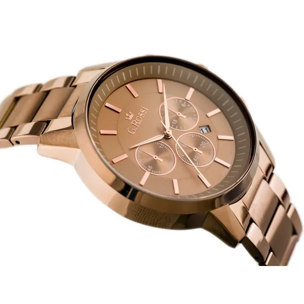 A G. Rossi 6647B férfi karóra elegáns kiegészítő, amely a japán MIYOTA kvarc szerkezettel pontos időmérést biztosít. A barna tónusú, IPB antiallergén bevonattal ellátott nemesacél tok és szíj rozéarany indexekkel kombinálva modern, mégis klasszikus megjelenést kölcsönöz. Az ásványi üveg védi a 41 mm-es számlapot a mindennapi karcolásoktól, míg a WR30 vízállóság megóvja az órát az esőcseppektől és a kézmosás közbeni fröccsenésektől.