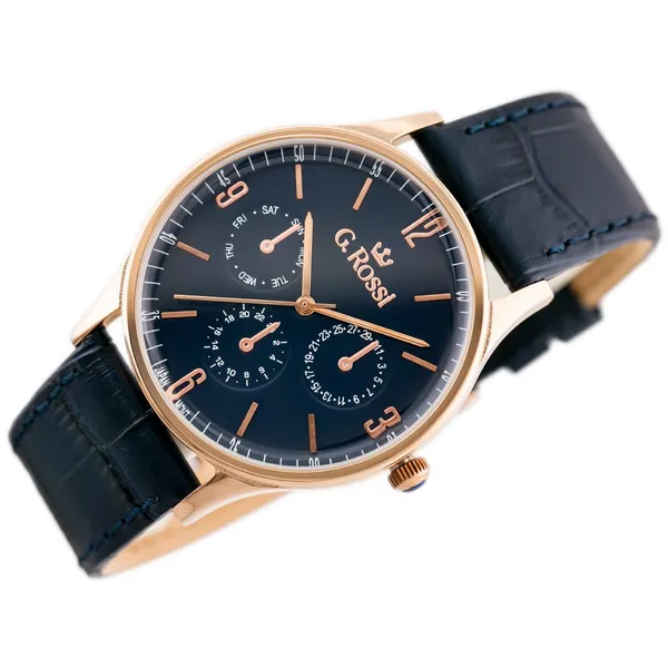 Férfi kvarc karóra bőrszíjjal, 42 mm, kék–rózsaarany, WR30