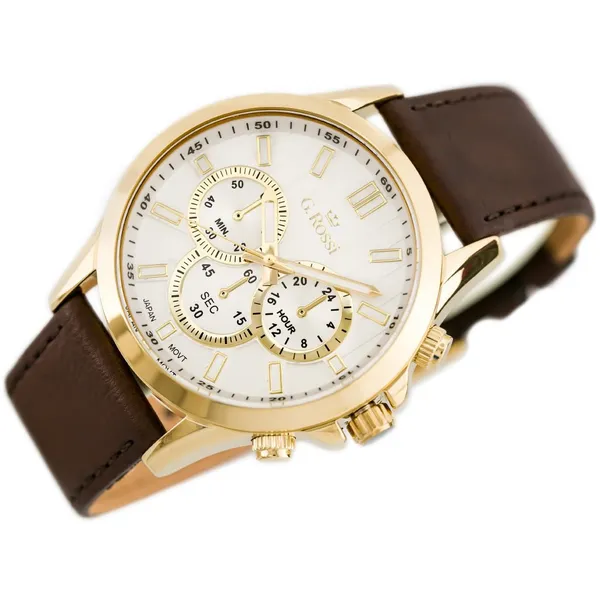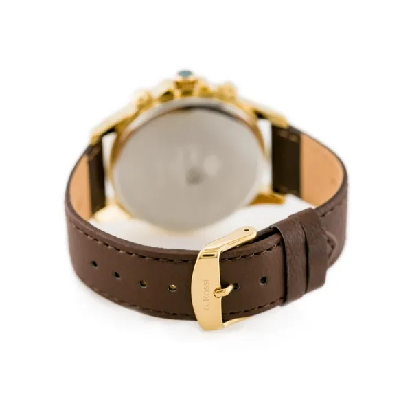 Elegáns, klasszikus stílusú férfi karóra ezüst színű számlappal, arany színű tokkal és barna bőrszíjjal. A kvarc szerkezet megbízható, pontos működést biztosít, a japán Miyota mechanika pedig a tartósságáról ismert. Az antiallergén IPG bevonat növeli az ellenállóságot és kényelmes viseletet nyújt a mindennapokban.