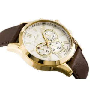 Elegáns, mindennapi viseletre is ideális karóra pontos japán kvarc szerkezettel, tartós mineral üveggel és kényelmes bőrszíjjal. Az arany színű tok és az ezüst számlap stílusos megjelenést ad üzleti és alkalmi öltözethez is.