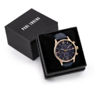 Elegáns megjelenést és kényelmes mindennapi viseletet kínál a sötétkék bőrszíj, a rozéarany tok és a könnyen kombinálható dizájn. Pontos kvarc szerkezete, dátumkijelzése és ajándék díszdoboza praktikus és stílusos választássá teszi.
