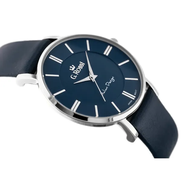 Elegáns és jól kombinálható férfi karóra sötétkék számlappal és hozzá illő bőrszíjjal. A japán Miyota Citizen kvarc szerkezet pontos működést biztosít, míg az antiallergén IPS bevonat növeli a tok ellenállóságát a mindennapi használat során. A kerek tok, az ezüstszínű részletek és a letisztult indexek időtálló megjelenést adnak.