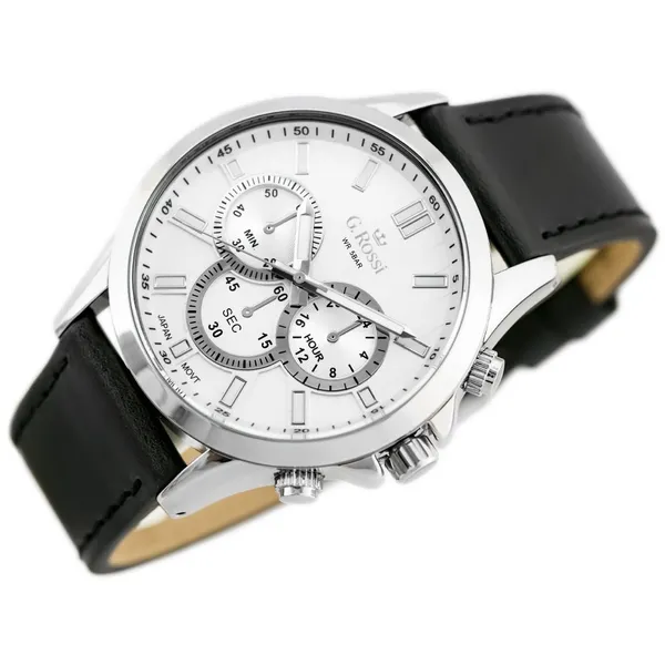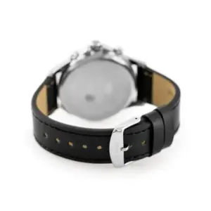 Férfi kvarc karóra elegáns, időtálló megjelenéssel. Az ezüstszínű számlap, a fekete bőrszíj és az ezüstszínű tok klasszikus kombinációja sokféle öltözékhez illik, legyen szó mindennapi viseletről vagy alkalmi megjelenésről.