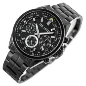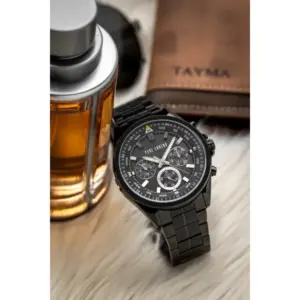 Férfi kvarc karóra fekete acél szíjjal, kronográffal, WR30